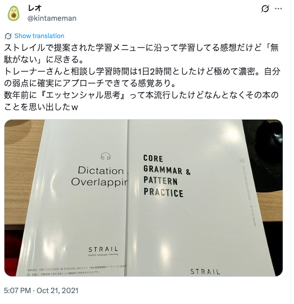 英語コーチングを受講しトータル4か月ほどで英会話力はビジネスでもそこそこ使える程度にまともになってきた実感です。 ストレイルでもこっからアウトプット練習の比重が増えてくるので頑張りたい。